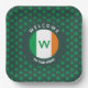 Modern monogram SHAMROCK square paper plates, designed with an all-over shamrock pattern against a dark green background. The Irish Flag is set within a circle. There is CUSTOMIZABLE curved text at the top and bottom of the circle, plus a MONOGRAM which is also customisable. This text can be replaced with a welcome message and/or personalised with your name, or name of your establishment. Ideal for your guests or patrons on St Patrick's Day.