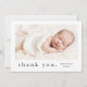 A simple photo baby thank you card featuring modern type and a large photo on the front. The back has a large full name header and personal message from the family. Click the edit button to customise this design with your photos and details.