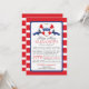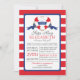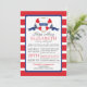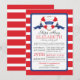 Modern red, white & blue nautical baby shower invitation for a baby girl shower. Our Ships Ahoy contemporary girl baby shower invitation features a red & white stripe heart Buoy with a blue banner with the word girl on it. The background is a bold & bright red and white horizontal stripe. Flip the invitation over for a matching stripe back. Visit our shop to view this for a boys baby shower and a gender neutral baby shower.