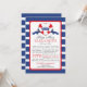 Modern red, white & blue nautical baby shower invitation for a gender neutral shower. Our Ships Ahoy contemporary boy or girl baby shower invitation features a red & white stripe heart Buoy with a blue banner with the word baby on it. The background is a bold & bright blue and white horizontal stripe. Flip the invitation over for a matching stripe back. Visit our shop to view this for a girls baby shower and a boys baby shower.