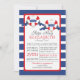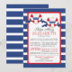 Modern red, white & blue nautical baby shower invitation for twin babies shower. Our Ships Ahoy contemporary twins baby shower invitation features two red & white stripe heart Buoy with blue banners with the word twins on them. The background is a bold & bright blue and white horizontal stripe. Flip the invitation over for a matching stripe back. Visit our shop to view this for a boys baby shower, girls baby shower and a gender neutral baby shower.