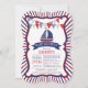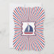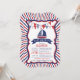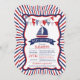 Modern bracket die cut baby shower invitation featuring a blue & red stripe and polka dots sailboat set on a red, white & blue radial stripe background. Our sweet shower design also features a modern baby bunting pendent with polka dots and anchor. Flip our cute summer baby shower invitation over to view a matching back for an extra special touch. Stylish & fun tropical boat baby shower invitation for a baby boy baby shower, gender neutral baby shower or a girls baby shower.