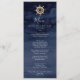 This modern nautical ship helm wedding dinner menu card is perfect for a beach or cruise wedding. The simple design features a gold boat wheel on a navy blue watercolor background.