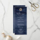 This modern nautical ship helm wedding program is perfect for a cruise or beach wedding. The simple design features a gold boat wheel on a navy blue watercolor background. Include the name of the bride and groom, the wedding date and location, thank you message, order of service, bridal party and an optional "in loving memory" memorial.