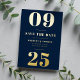 Modern save the date featuring your numeric wedding date in bold gold foil lettering with a navy background. Personalise the navy and gold foil save the date card by adding your names, wedding date, and wedding location.