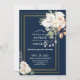 This is Navy Blue Burgundy Gold Blush Pink Wedding Invitations card. This card feature is a dark navy blue background decorated with a printed gold geometric frame that's trimmed with floral and greenery elements in shades of navy, pink, burgundy and more.