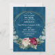 This is Navy Blue Burgundy Gold Blush Pink Wedding Invitations card. This card feature is a dark navy blue background decorated with a printed gold geometric frame that's trimmed with floral and greenery elements in shades of navy, pink, burgundy and more.