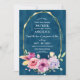 This is Navy Blue Burgundy Gold Blush Pink Wedding Invitations card. This card feature is a dark navy blue background decorated with a printed gold geometric frame that's trimmed with floral and greenery elements in shades of navy, pink, burgundy and more.