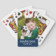 Modern custom playing cards feature a favourite family photo with simple monogram text that can be personalised with a last name. Note, the white text and navy blue background colours can be modified via customise.