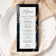This elegant, modern wedding menu features a watercolor navy blue agate background trimmed with gold faux glitter. The text appears in elegant charcoal grey handwriting and sans serif fonts on a white rectangle. The agate design is repeated on the reverse.