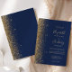The left-hand edge of this elegant modern wedding invitation features a gold faux glitter design. The customisable text combines pale gold coloured handwriting, copperplate and italic fonts on a navy blue background. The reverse side features a matching navy blue and gold glitter design.