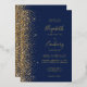 The left-hand edge of this elegant modern wedding invitation features a gold faux glitter design. The customisable text combines real gold foil handwriting, copperplate and italic fonts on a navy blue background. The reverse side features a matching navy blue and gold glitter design.