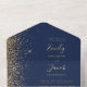 The left-hand edge of this elegant modern all-in-one wedding invitation and RSVP features a gold faux glitter border. The customizable text combines gold-colored whimsical handwriting, copperplate and italic fonts on a navy blue background. The return address appears on the outside flap and the reverse side of the detachable RSVP card in gold-colored text on solid navy blue.