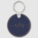 signature chic typography navy blue gold round keychain with a feminine classy touch with your general name in a calligraphy fancy font and your profession.