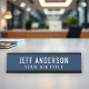 Modern white and navy blue desk name plate includes the employee's name and professional job title in stylish fonts. Can be fully personalised with your custom text and colours, and your choice of frame colour.