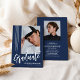 Our minimalist graduation party invitations are not just about simplicity but a creative twist to tradition. The classic blue backdrop, adjustable to any shade that matches your theme, adds a trendy touch. Showcase the grad's memorable photo and enjoy the rainfall of white lines, a clever nod to tassel strings. Plus, our modern text template is a breeze to personalise. Make the graduation announcement as unique as your graduate with these chic invitations.