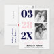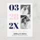 Modern navy blue and blush pink two photo Save the Date postcard. It showcases the date in navy blue and blush pink typography in a column and two photos of the couple. The phrase "Save the Date" is in script style typography.