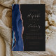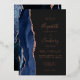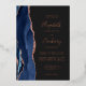 The left-hand edge of this elegant modern wedding invitation features a navy blue watercolor agate border trimmed with faux rose gold glitter. The customisable text combines handwriting, copperplate and italic fonts in real rose gold foil on an off-black background. The reverse side features a matching navy blue and rose gold agate design.