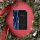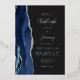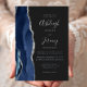 The left-hand edge of this elegant modern wedding invitation features a navy blue watercolor agate border trimmed with faux silver glitter. The customisable text combines handwriting, copperplate and italic fonts in real silver foil on a dark background. The reverse side features a matching navy blue and silver agate design.