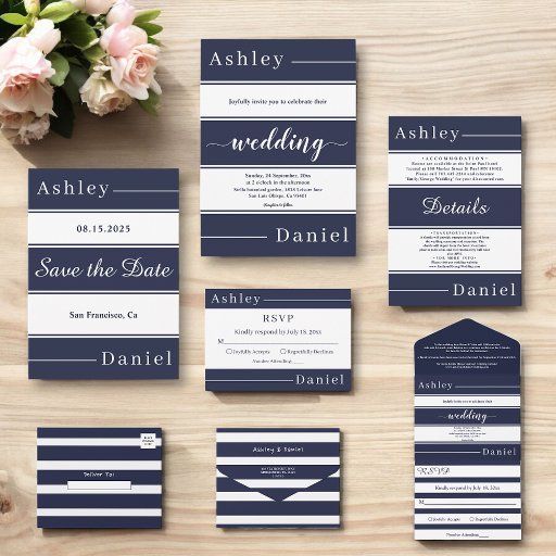 Modern Navy Blue White Stripes Elegant Wedding All In One Invitation