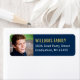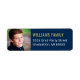 Modern custom address label design features a graduation photo of the graduate with gold and white return address text and dark navy blue background. Customise the text and background colours to coordinate with the photo or school / university colours!