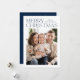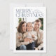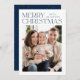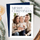 Modern Christmas photo card featuring "Merry Christmas" displayed at the top of the design in trendy navy lettering with a white background. Personalize the simple Christmas card with your family name and photo. The card reverses to display a navy background with subtle white dots (snow).