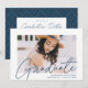 Invite guests to celebrate the graduation with our modern photo graduation party invites. The trendy graduation party invites feature the graduate's photo with "Graduate" in a navy modern calligraphy script overlay. Personalize the front of the invites by adding the graduate's name, school name, and graduation year. The invite reverses to display your graduation party details and a trendy navy and white dotted geometric pattern.