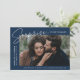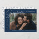 Share the news of your surprise engagement with these elegant photo engagement announcements. The design features the phrase "Surprise, we got engaged!" in a trendy white script and modern lettering on a navy background. Your engagement photo is featured in the centre-right part of the design with your names and engagement date displayed on the left. Personalise the surprise engagement announcement by adding additional details below such as wedding city/state, wedding website, etc. The announcement reverses to display a navy foliage pattern on a white background.