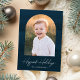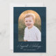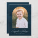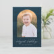 Modern holiday photo card featuring your favorite image inside a chic arch frame against a deep navy watercolor backdrop. “Happiest Holidays” appears in crisp white handwritten script with your family name below for a personalized touch. The reverse continues the look with a coordinating navy watercolor brushstroke pattern, creating a stylish, cohesive design for sending warm holiday greetings.