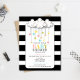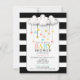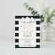 A modern baby shower invitation featuring an illustration of clouds with hearts over a black and white striped background.