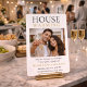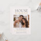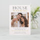 Modern new home design featuring neutral blush tones, bold serif typography, and a centered photo layout with gold accent text. Clean, photo-forward style suited for announcing a move and inviting guests to a housewarming gathering with a polished, contemporary look.