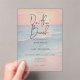 Celebrate your special day with the simplicity and tranquility of a transparent acrylic watercolor beach scene wedding invitation that invites your guests to join your celebration, "on the beach". The soft, warm coral and blush hues of the sunset compliment the aqua and blues of the peaceful sea, making this design perfect for your beachside or destination wedding. Created by Simply Farmhouse Press.