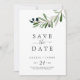 This modern olive branch save the date card is perfect for a boho wedding. The rustic yet elegant design features simple watercolor botanical green leaves and black olives on a small branch with a classic mediterranean feel.
