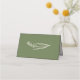 A simple and modern olive green wedding place card, featuring script lettering on the front, and a floral element on the back.