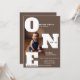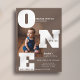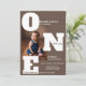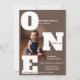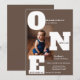 A modern and bold first birthday invitation in a rich mocha brown, featuring oversized “ONE” lettering for a clean, eye-catching design. Personalise it with your own photo to make it uniquely yours. A standout option for those looking for a sophisticated alternative to traditional "too-cute" baby-themed invites.