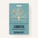 Name tag wwith a muted green background layered over top is a light yellow tree with 2 orange bird silhouettes sitting on the branches.