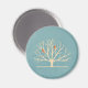 A magnet with a muted green background layered over top is a light yellow tree with 2 orange bird silhouettes sitting on the branches.