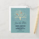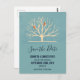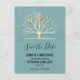 A wedding save the date postcard with a muted green background layered over top is a light yellow tree with 2 orange bird silhouettes sitting on the branches.