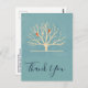 Thank You postcard with a muted green background layered over top is a light yellow tree with 2 orange bird silhouettes sitting on the branches.