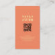 Business card design with an orange chequered pattern in a clean, minimal layout, featuring a QR code for easy access to a website or portfolio. Suitable for handmade clothing brands, boutique shops, or creative professionals.