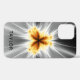 This personalised iPhone case features abstract fractal art in orange, black, white and grey shades with a customisable name in black font at the bottom.