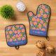 This Modern Orange Stylish Personalised set has a pretty citrus pattern design in blue and orange, with pink blossoms, with a space to add a personalised name and favourite kitchen quote or use "Queen of the Kitchen". This unique set of personalised women's mitts and pot holder makes a great gift for a special cook in your life.