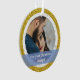 Splashy yet elegant Our First Christmas Engaged personalised photo Xmas ornament for recently engaged couples, with modern cursive typography / hand lettering on a stylish semitransparent blue band, a frame of white and silver snowflakes and little stars, and another frame of simulated golden glitter. Make sure you personalise at least the two photos (front and back), and the first names and the year on the back.