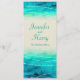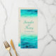 Beautiful blue green painted sea with graphic waves sparkle overlay wedding menu. A beautiful beach, coastal ocean inspired, contemporary, wedding invitation featuring a unique stylised, hand watercolor sea, on a sand colour paper. Perfect for a modern beach wedding. Edit this invitation with your own words. Unique designed and painted by Sarah Trett.