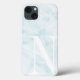 Elegant monogrammed phone case features a printed marble patterned background in pale, ethereal shades of pastel aqua and mint green. Add your single initial monogram in oversized classic white lettering, aligned at the lower right for a modern twist.