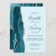 The left-hand edge of this elegant modern wedding invitation features a teal watercolor agate border trimmed with faux silver glitter. The customisable text combines handwriting, copperplate and italic fonts in dark teal on a pale teal background. The reverse side features a matching teal and silver agate design.