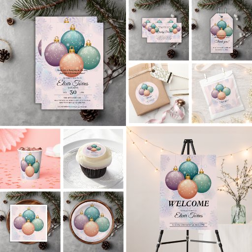 The Modern Pastel Christmas Ornament Baby Shower Collection blends soft, serene pastels with festive holiday charm for a baby shower that feels both chic and cosy. Featuring pastel-hued Christmas ornaments, delicate snowflakes, and subtle winter greenery, this collection creates a warm, elegant atmosphere perfect for celebrating the upcoming arrival. If you need any other matching product or customisation, kindly message via Zazzle.