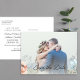 Trendy elegant budget photo overlay wedding save the date postcard featuring black and white line art style chic hand-drawn floral and foliage sketches and watercolor pastel dusty blue and peach botanical blooms.