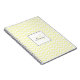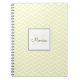 Personalised spiral notebook features pastel yellow chevron pattern with custom name in black handwriting font and monogram in matching yellow shade in white square frame.