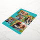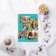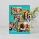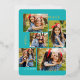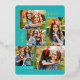 This stylish five photo collage Christmas card features modern typography reading, PEACE, JOY, and LOVE in real gold foil over an aqua coloured background (the colour can be customised to any colour you'd like). The back of the card contains a matching faux foil Christmas trees pattern over a custom colour background (shown in white).
